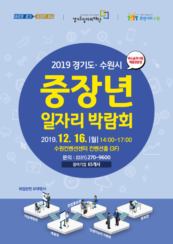 수원시는 오는 16일 오후 2시부터 5시까지 수원컨벤션센터 3층 컨벤션홀에서 ‘2019 경기도·수원시 중장년 일자리 박람회’를 개최한다.
