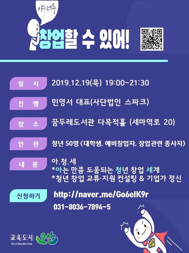 오산시 관계자는 “이번 행사는 청년 창업관련자는 누구나 참여가 가능하고 QR코드를 통해 신청할 수 있다”며, “청년들이 다양한 기회를 접하고, 서로의 경험을 공유하며 이런 행사가 지속 마련되어 청년 창업플랫폼으로 확대되길 바란다”고 밝혔다.