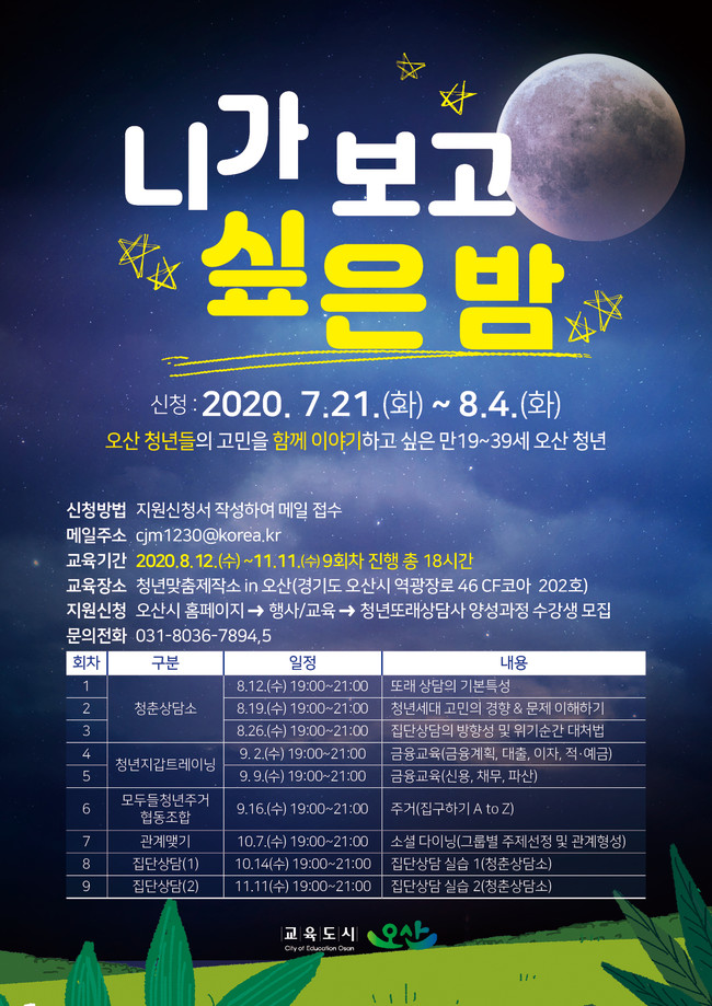 [오산=로컬라이프] 송준형 기자 = 오산시(시장 곽상욱)는 코로나19로 어려움을 겪는 청년들의 멘토링을 지원하고 소통창구를 마련하기 위해 청년또래상담사 양성과정(‘니가 보고 싶은 밤’) 참여자를 모집한다.