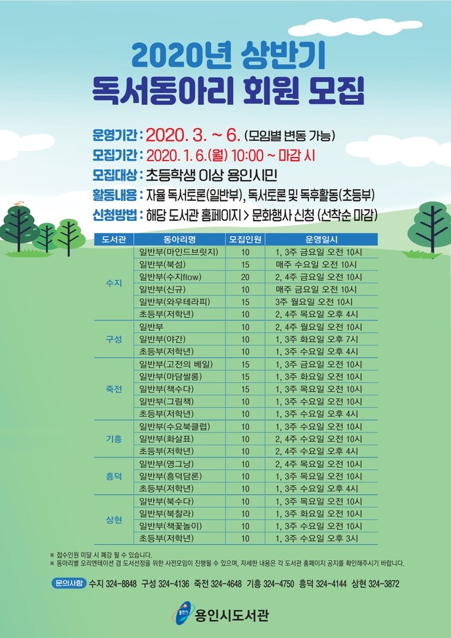 한편, 중앙 ‧ 포곡 ‧ 동백 ‧ 모현 ‧ 보라 ‧ 남사 ‧ 양지 ‧ 이동 등 동부지역 도서관 8곳은 2월4~14일 독서동아리 회원을 모집할 예정이다.