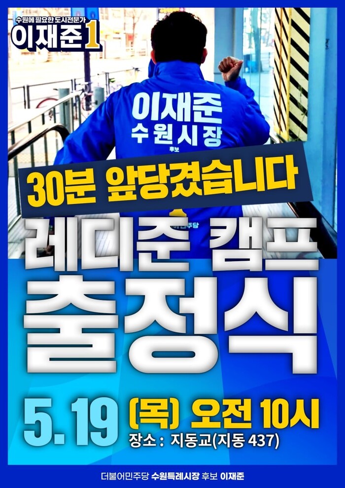 6·1지방선거를 앞두고 더불어민주당 이재준 수원시장 후보가 19일 오전 10시 김동연 경기도지사 후보를 비롯한 수원지역 시·도의원 후보와 함께 수원 지동교에서 합동 출정식을 갖는다.