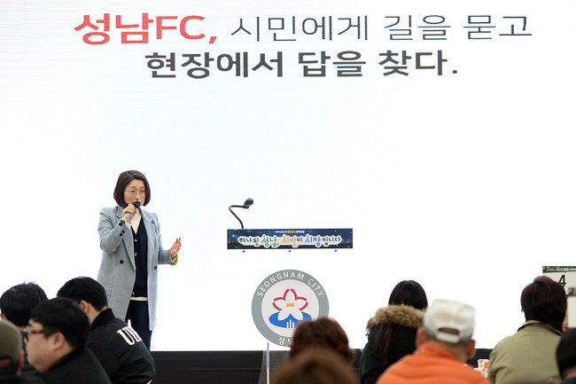 이날 은수미 성남시장은 인사말을 통해 ‘성남fc 활성화를 위한 공동의 뜻을 갖고 한자리에 모인 300여 명의 시민들께 감사드리며 오늘 이 자리에서 성남FC의 발전을 위한 참신한 방안들이 나오길 기대한다’고 말했다.