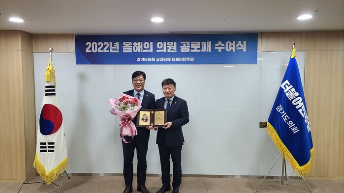 경기도의회 농정해양위원회 최만식 의원(더불어민주당, 성남2)이 7일 경기도의회 중회의실에서 열린 ‘2022년 더불어민주당 올해의 의원 공로패 수여식’에서 공로패를 수상했다.