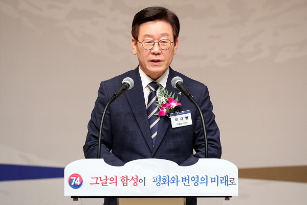 | ▲ 이재명 경기도지사는 최근 일본의 경제침략에 대해 단호한 대응과 함께 위기를 기회로 삼는 정책적 노력이 필요하다고 강조한다. 사진은 지난 15일 오전 경기도경제과학진흥원 경기홀에서 열린 ‘제74주년 광복절 경축식’에서 이재명 도지사가 경축사를 하는 모습. (사진제공=경기도) |