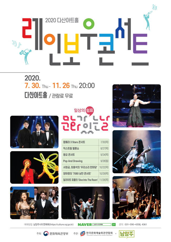 한편, 문화가 있는 날 ‘다산아트홀 레인보우 콘서트’는 남양주티켓예매 홈페이지(https://culture.nyj.go.kr)를 통해 선착순으로 사전 예약으로만 관람할 수 있으며, 기타문의사항은 남양주시 티켓예매 홈페이지를 통해 확인하거나 문화정책과 공연운영기획팀(☎031-590-4361,4358)로 문의하면 된다.