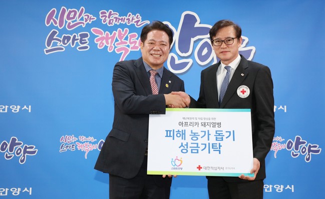 최대호 안양시장은 집무실에서 대한적십자사 경기도지사 사무처장 등 관계자 10여명이 참석한 가운데 아프리카 돼지열병(ASF)으로 피해입은 농가를 돕는데 써달라며 성금 백만원을 전달했다.