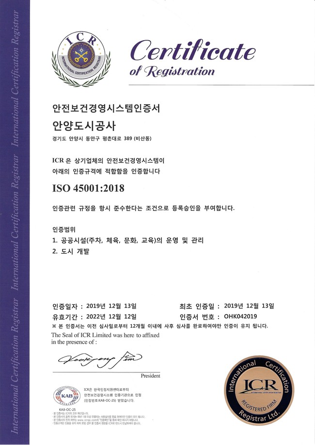 안양도시공사는 ISO 인증 취득을 위해 안전보건 매뉴얼‧절차서‧지침서를 국제 기준에 부합하도록 제정하고, 전 사업장의 업무‧작업‧시설에 대한 위험요소를 찾아 시정 조치했다.