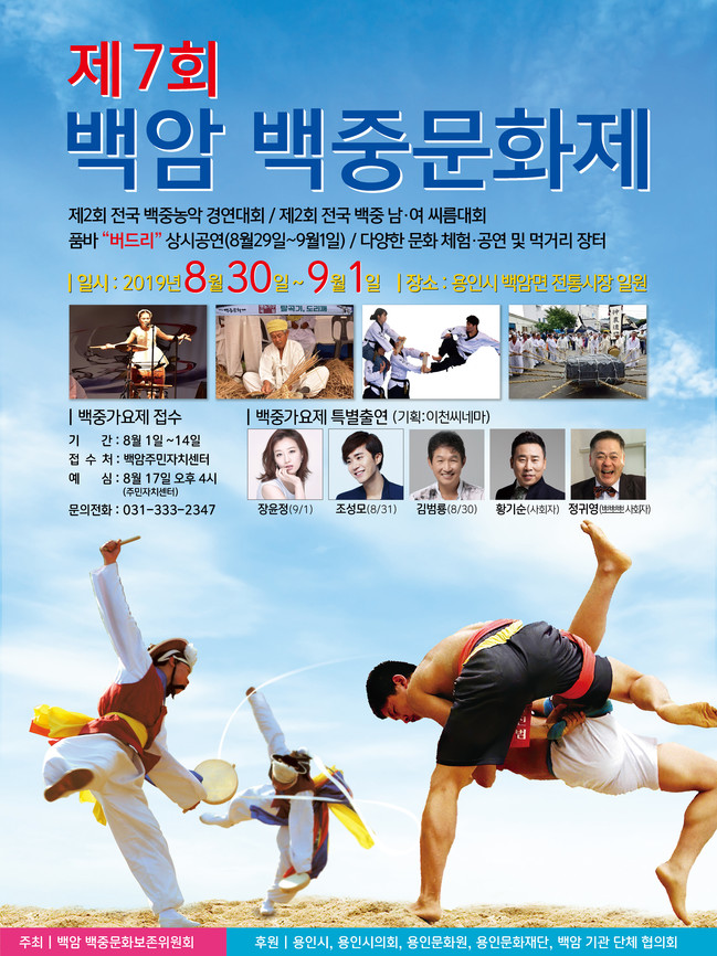 [용인=로컬라이프] 송준형 기자 = 용인시 처인구 백암면은 백암 백중문화보존위원회 주최로 지역 전통민속축제인 ‘제7회 백암백중문화제’가 오는 30일부터 9월1일까지 백암장터 일원에서 열린다고 밝혔다.