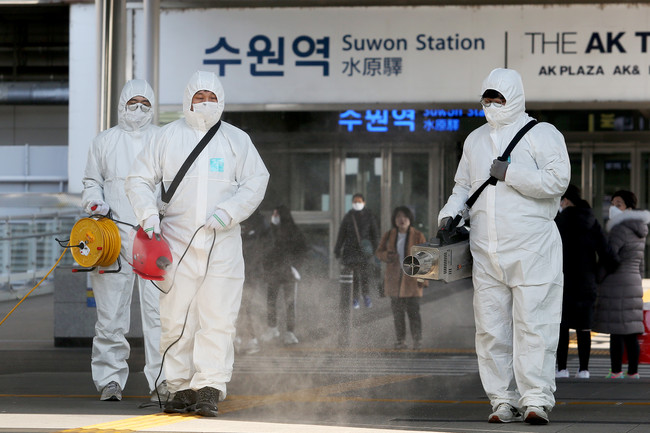 [수원=로컬라이프] 송준형 기자 = 수원도시공사 신종 코로나바이러스 감염 확산저지를 위해 비상대책을 수립하고 총력대응을 하는 가운데 3일 오후 공사 관계자가 수원역환승센터에서 방역작업을 벌이고 있다.