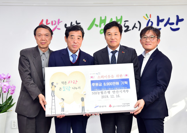 사진/ 윤화섭 안산시장이 16일 NH농협은행 안산시지부로부터 지역 소외계층을 위한 후원금을 기탁 받고 기념촬영을 하고 있다.