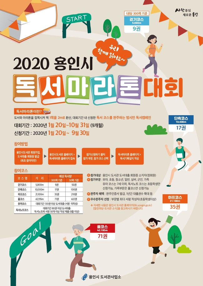참가를 원하는 사람은 용인시 도서관 홈페이지 독서마라톤 코너에서 9월30일까지 신청하면 된다. 대회 신청기간 중 제한없이 코스를 변경할 수 있다.