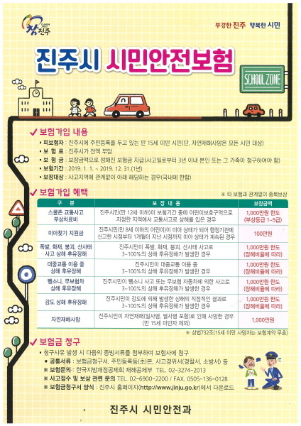 진주시는 일상생활에서 발생할 수 있는 불가피한 사고 및 재난으로부터 피해를 입은 시민들이 최대 1000만원의 피해보상 혜택을 받을 수 있는‘시민안전보험’에 가입해 지난 1월부터 시행에 들어갔다고 밝혔다.