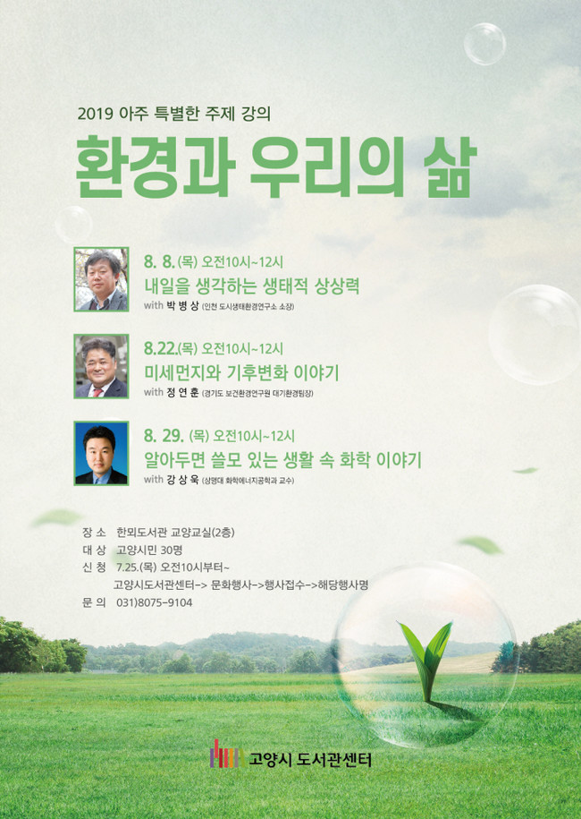 8월, 한뫼도서관에서는 ‘환경과 우리의 삶’을 주제로 강의를 진행한다. 일상이 되어버린 미세먼지부터, 환경과 공존하는 법을 알려주는 생태의 개념, 건강하게 살기 위한 일상 속 화학제품이야기까지 환경이슈에 대해 함께 이야기해보는 시간이다.
