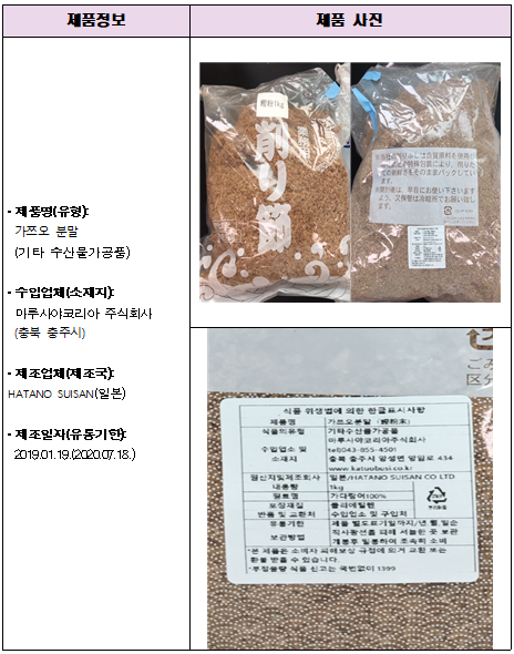 식품의약품안전처는 수입식품판매업체 ‘마루사야코리아 주식회사’가 수입·판매한 ‘가쯔오 분말’에서 벤조피렌이 기준 초과검출되어 해당 제품을 판매중단 및 회수 조치한다고 밝혔다.