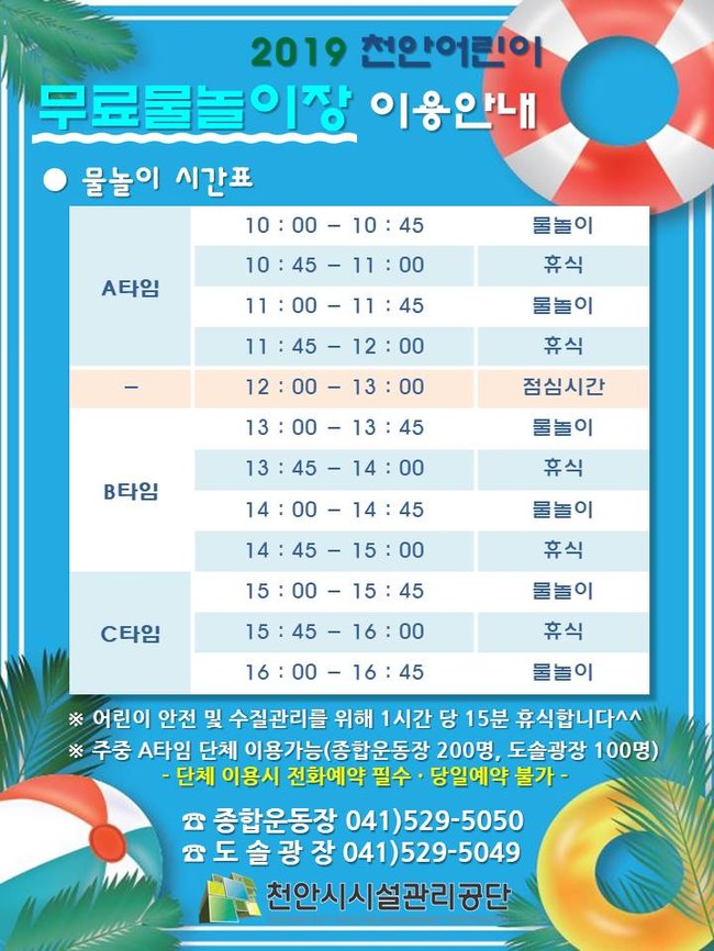2개 물놀이장 모두 어린이 안전과 수질관리를 위해 A타임, B타임, C타임으로 나뉘어 운영된다. A타임은 오전 10시부터 11시 45분까지이고, B타임은 오후 1시부터 2시 45분까지, C타임은 오후 3시부터 4시 45분까지 열린다.