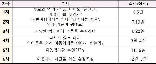 각 주제와 관련된 아동분야 전문가 이해당사자 관계기관 담당자 등을 초청해 아동학대에 대한 인식차이를 확인하며, 서로 간 이해를 바탕으로 그 간극을 좁혀가기 위해 끊임없이 노력할 계획이다.