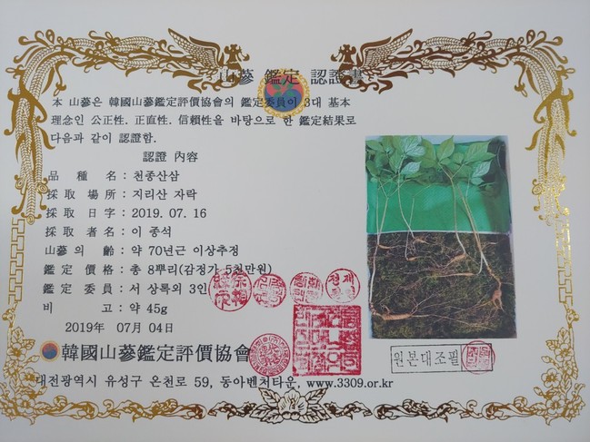 이씨는 발견한 산삼을 조심스럽게 채취해 전문 산삼감정사를 통해 감정을 받은 결과 70년근 이상임을 공증받았다. 천종산삼은 사람 손이 닿지 않는 깊은 산에서 자연 상태로 자란 산삼으로 이번에 이씨가 발견한 산삼 8뿌리 45g의 감정가는5,000만원으로 평가됐다.