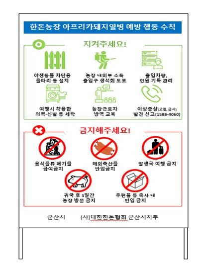 시 관계자는 “대한한돈협회 군산시지부와 합동으로 양돈농가의 방역의식을 향상시키기 위한 방역교육을 매달 1회 실시하고 있다”면서 “아프리카돼지열병 발생방지를 위한 농가 방역수칙 입간판을 제작해 관내 양돈농가 입구에 설치할 예정이다”고 말했다.