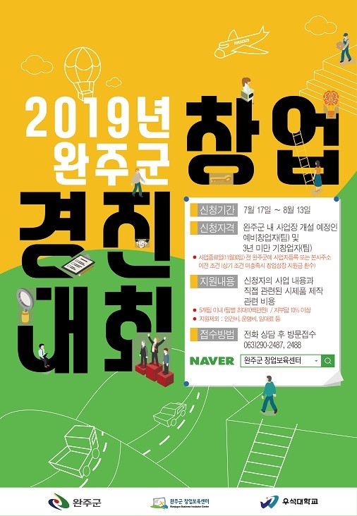 23일 완주군 창업보육센터는 지역의 창업문화 확산과 창업자들의 성공창업을 지원하기 위해 완주군이 후원하고 우석대학교 산학협력단이 주관하는 ‘2019년 완주군 창업경진대회’를 개최한다고 밝혔다.