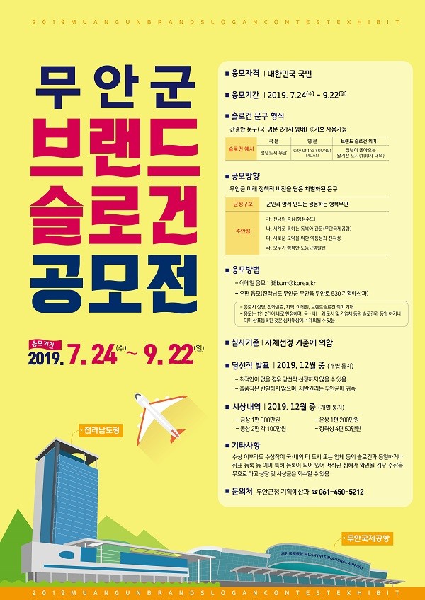 무안군은 오는 24일부터 9월 22월 두 달 동안 도시 브랜드 슬로건 전국 공모전을 실시한다고 밝혔다.무안군은 무안국제공항 활성화 및 항공특화산단 조성 등 변화한 대내외 환경에 대응하고 도시 정체성 및 무안의 미래비전을 함축적으로 제시할 수 있는 브랜드 슬로건을 공모하기로 했다.
