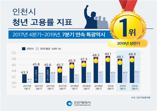 인천시가 2019년 상반기에도 청년고용률 전국 특·광역시 1위를 달성, 2017년 4분기부터 7분기 연속 특·광역시 1위를 차지했다.