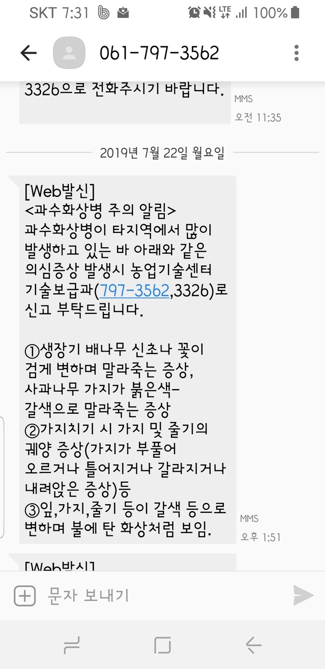 또한 배나무 신초가 검게 변하며 말라죽는 증상, 사과나무 가지가 붉은색-갈색으로 말라 죽는 증상, 가지치기 시 가지 및 줄기의 궤양 증상 등의 이상 발견 시에는 지체없이 농업기술센터 기술보급과 및 농업인상담소로 신고해야 한다.