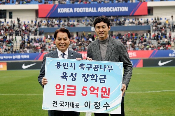 [경기=로컬라이프] 김보경 기자 =용인시인재육성재단은 지역 출신의 국가대표 수비수 이정수 선수가 유소년 축구 꿈나무들을 돕기 위해 5억원의 장학금을 기부했다고 25일 밝혔다.