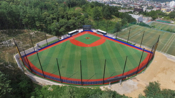 바로 옆으로는 지난해 3월 개장한 국제표준규격의 성인 야구장이 있다. 좌·우 펜스까지 95m, 중앙펜스 까지 105m의 거리를 두고 더그아웃, 야간조명, 전광판, 관람석 등을 갖췄다.