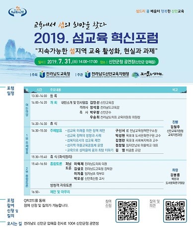 전라남도교육청이 주최하고, 신안교육지원청과 목포대학교 도서문화연구원이 공동주관하며, 신안군청이 후원하는 ‘섬교육 혁신포럼’이 오는 31일 오후 2시 신안군청 공연장에서 열린다.