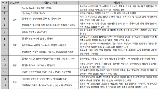 일반공모 분야에서는 ON THE ROAD 붕붕, His Story 문래라이프 일상예술을 꿈꾸다, 문래 예술가 활성화를 위한 품앗이 예술문화 만들기, 영등포 한솥밥 4개 사업이 선정됐다.