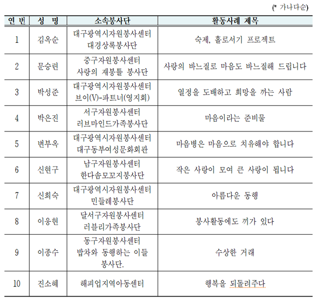 김영애 대구시 시민행복교육국장은 “더불어 살아가는 것을 몸소 실천하시는 자원봉사자들께 감사드리며, 한분 한분의 소중하고 의미 있는 이야기는 또 다른 봉사를 이끌어 낼 마중물이 될 수 있다고 생각한다”며 “대구시는 지속적으로 자원봉사 문화가 확산될 수 있는 다양한 시책을 마련하겠다”고 밝혔다.