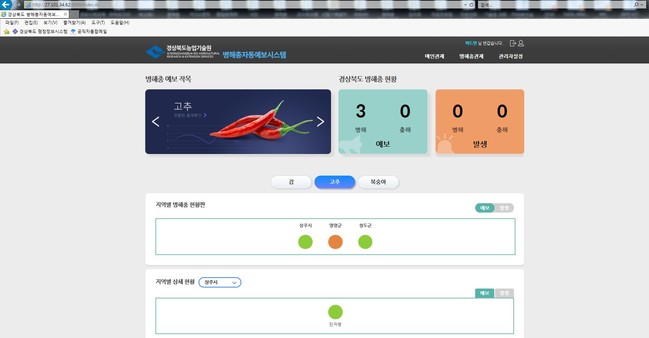 경상북도 농업기술원은 이상기후로 인한 농업인들의 애로사항 해결을 위해 농업과 기상정보를 활용한 ‘주요 농작물 병해충 예보시스템’을 개발하여 병해충 발생에 대한 예측과 신속한 진단 및 대응체계를 구축했다고 밝혔다.