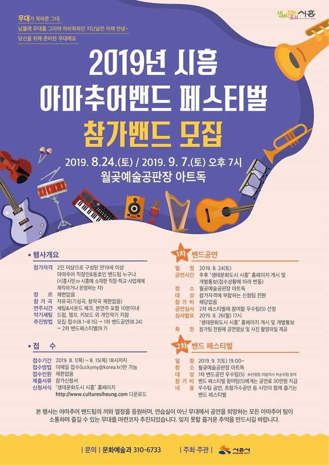 [경기=로컬라이프] 한석훈 기자 = 시흥시에서는 관내 아마추어밴드의 끼와 열정을 응원하며 아마추어 밴드팀이 소통하며 즐길 수 있는 무대를 마련하기 위해 ‘2019 시흥 아마추어밴드 페스티벌’을 개최하고 오는 8월 1일부터 15일까지 보름간 참가자를 모집한다.