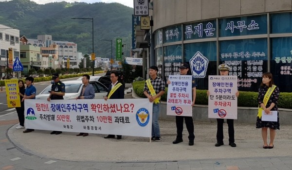 하동군은 30일 아침 경찰서 앞 회전교차로 일원에서 하동경찰서와 함께 장애인전용주차구역 지키기 홍보캠페인을 펼쳤다.