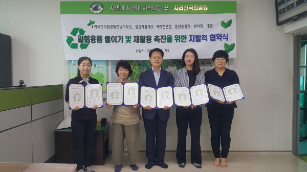지리산국립공원전남사무소는 국립공원내 수익시설물을 운영하는 사업자와의 자발적 협약을 통해 일회용품 사용 줄이기 및 재활용 촉진을 위한 상호간 협력과 상생발전을 위해 노력하기로 합의했다.