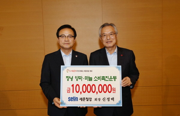 신정택 세운철강 회장은 지난 26일, 창녕 양파·마늘 소비촉진 운동의 일환으로 창녕 양파·마늘을 구입하여 어려운 이웃에게 나눠주기 위해 창녕군에 성금 1,000만원을 기탁했다.