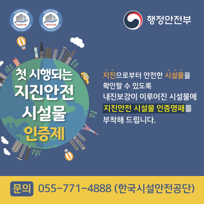 한편 지진안전 시설물 인증제도는 내진보강이 이뤄진 시설물에 대해 행정안전부와 한국시설안전공단이 인증하고, 시설물에 인증 명판을 부착하는 제도로 지난해 10월 지진·화산재해대책법이 개정된 이후 올해 3월부터 본격 시행됐다.