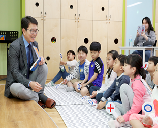 성수글로벌체험센터에서 정원오성동구청장과 아이들이 영어 동화책을 함께 읽고 있다.