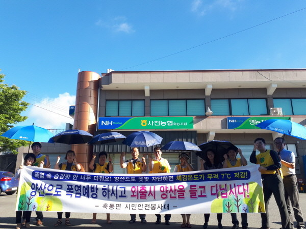 축동면 만남의 광장 일원 및 사천축동농협에서 실시한 이번 캠페인은 연일 지속되는 폭염피해 예방 홍보를 위해 양산쓰기 생활화 운동을 홍보하고 홍보 물품인 양산과 부채를 배부했다.