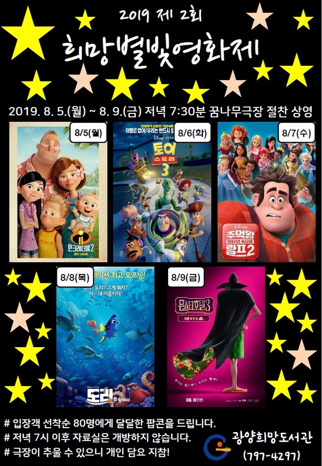 광양희망도서관에서 오는 5일부터 9일 저녁 7시 30분 도서관 3층 꿈나무극장에서 ‘제2회 희망별빛영화제’를 개최한다고 밝혔다.