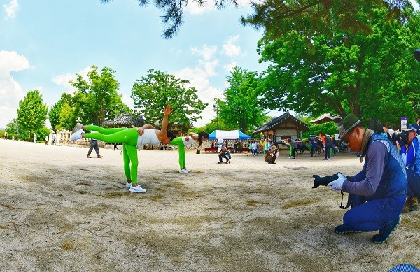 제1회 자연속의 밀양요가, 밀양요가 영남루 가다! 에서 요가동작을 포착하고 있는 사진작가들의 모습