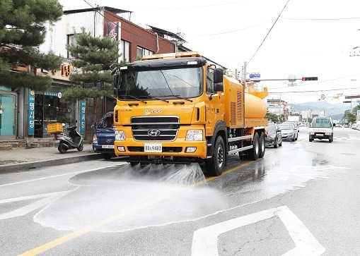 군은 태풍과 장마 이후 폭염이 본격적으로 시작됨에 따라 군민들의 체감온도 저감과 폭염피해예방을 위해 시가지 도로 살수를 위한 살수차를 가동하기로 했다.
