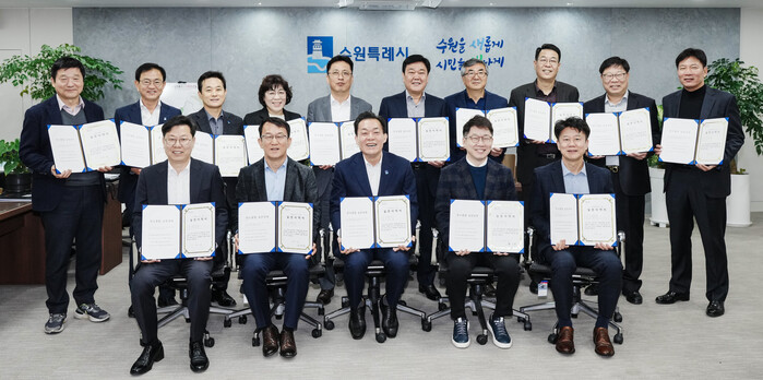 사진/이재준 수원시장(앞줄 가운데), 조청식 제1부시장(앞줄 왼쪽 2번째), 황인국 제2부시장(앞줄 오른쪽 2번째) 등 간부공무원이 실천서약서에 서명한 후 기념촬영을 하고 있다.(사진제공=수원시)