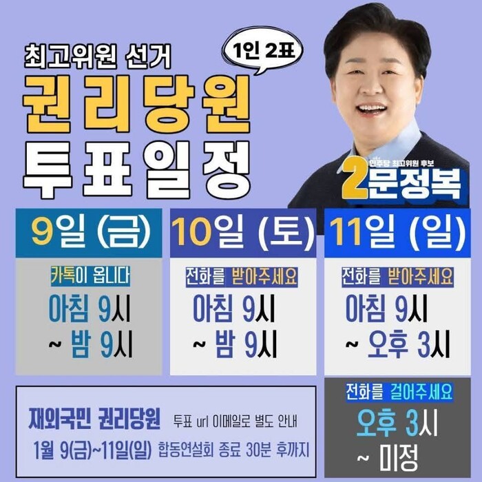 아울러 “오늘도 어딘가에서 누군가에게 당신의 소망과 희망을 담아 응원하고 계실 민주당 평당원 당신들께 저의 마음을 바친다. 평당원 여러분 덕분에 이재명 대통령이 계신다. 정청래당대표가 있다. 저 문정복이 있다. 친명,친청은 없다”며 “원팀 원보이스이다. 오직 친민주, 친대한민국만 있다. 도와달라. 함께해 달라. 저는 영원한 평당원 문정복이다. 평당원 당신이 문정복이다. 문정복은 영원한 평당원이다”라고 강조했다.