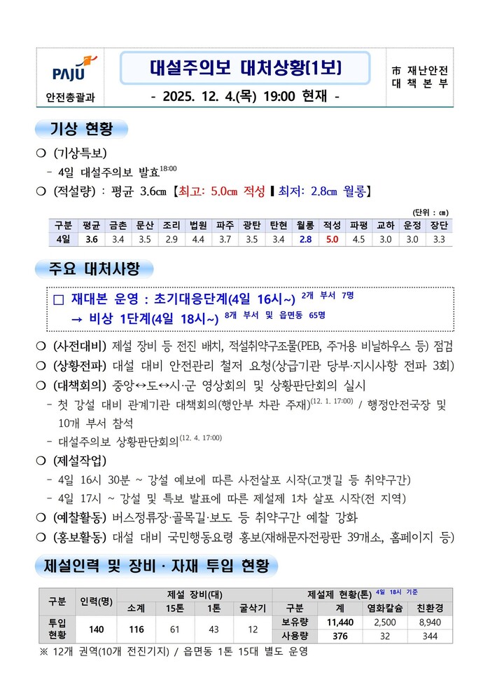 [파주=로컬라이프] 송준형 기자 = 파주지역 대설주의보 발표(4일, 18시 발효)에 따라 파주시 재난대책본부 비상1단계 운영하여 대응 중이다.