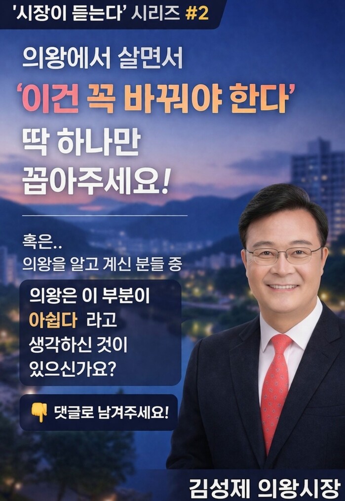 그래서 오늘은 묻는다. 의왕에서 살면서 “이건 꼭 바뀌어야 한다” 딱 하나만 꼽아주시라며, 생활 속 불편, 행정에 대한 아쉬움, 도시의 방향에 대한 고민까지 어떤 이야기라도 좋다. 여러분의 의견은 가볍게 넘기지 않겠다고 말했다.