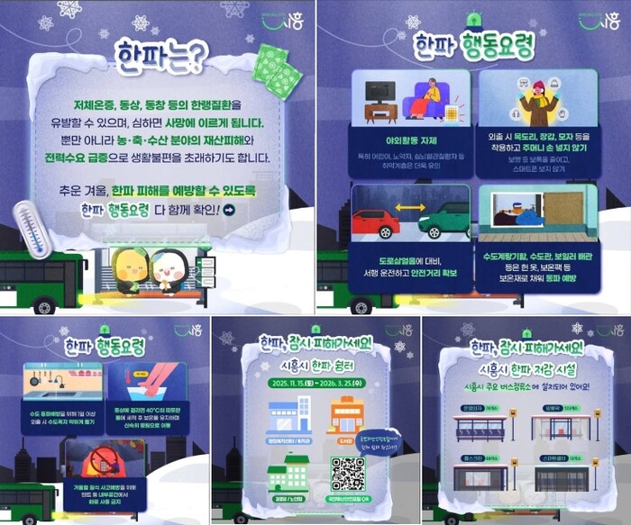 시흥시 공식 안내글에서는 "한파주의보 이렇게 대비하세요. 갑작스러운 한파, 어떻게 대비해야 할까요? 우리 모두의 안전을 지키는 한파 대비 국민행동요령! 일상 속 작은 실천으로 큰 사고를 예방하고, 내 가족과 이웃을 지키는 따뜻한 겨울 보내기! 추위가 걱정될 땐 가까운 '한파 쉼터'와 버스정류장 곳곳에 설치된 '한파 저감 시설'도 적극 활용하세요!"라고 말했다.