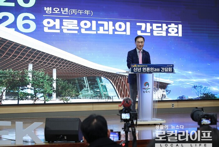[평택=로컬라이프] 박봉민 기자 = 정장선 평택시장이 19일, 신년 언론인 간담회를 열어 새해 주요 시정 방향을 밝혔다. 이번 간담회에는 100여 명의 언론인과 정장선 평택시장을 비롯한 간부 공무원이 참석했으며, 주요성과 발표, 2026년 주요 시책 설명, 질의응답 순으로 진행됐다.