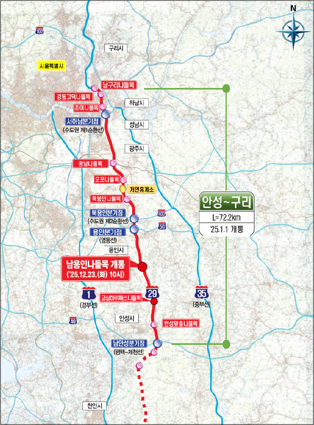 안성~용인~구리 구간(72.2㎞)은 1월 1일 개통됐다. 이 가운데 처인구 모현읍에서 원삼면까지 용인을 남북으로 관통하는 구간의 길이는 26㎞다. 포천~구리 구간(44.6㎞)은 지난 2017년 개통됐고, 안성~세종 구간(59.5㎞)은 2026년 말 개통 예정이다.
