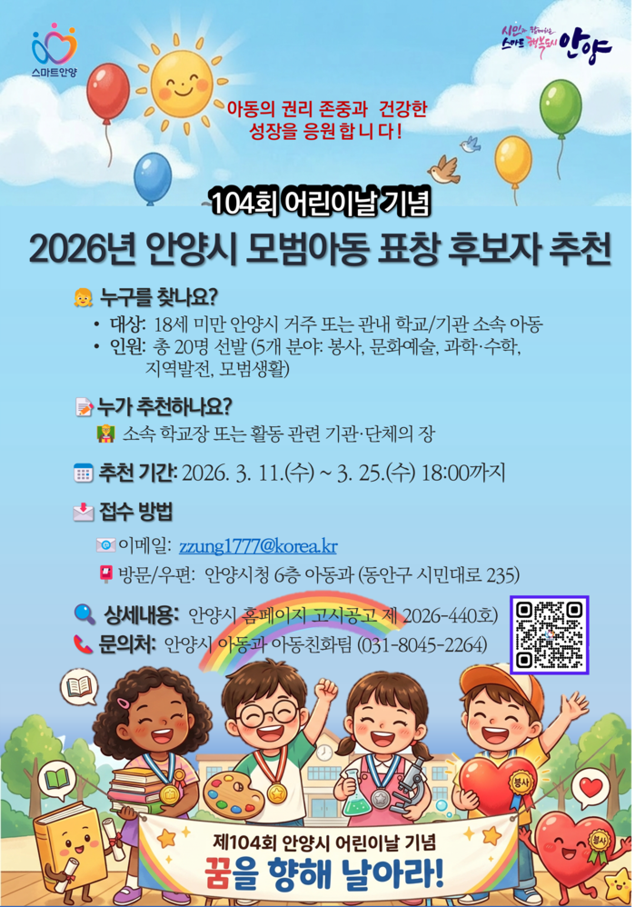안양시는 어린이날을 맞아 다양한 분야에서 모범이 되는 아동을 발굴하기 위해 ‘2026년 모범아동 유공 표창’ 후보자를 11일부터 25일까지 추천받는다고 11일 밝혔다.